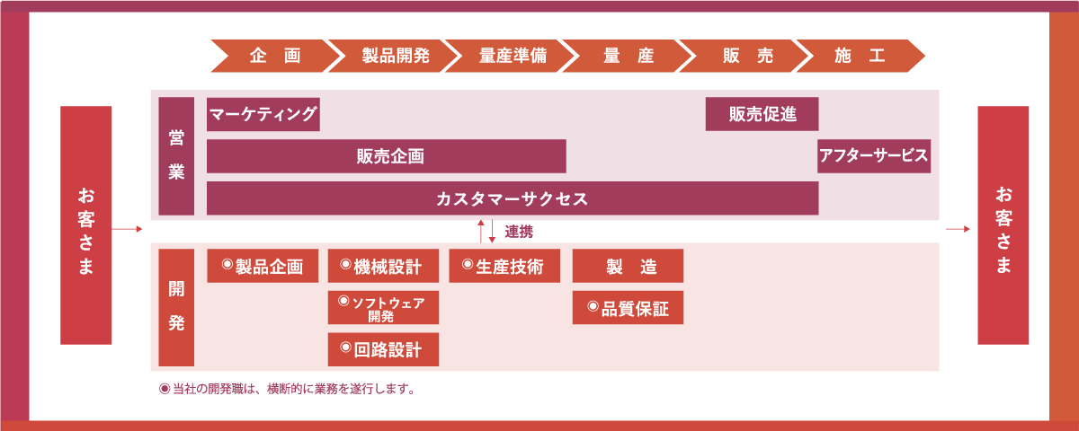 当社の開発現場では、製品の一部分を担当するのではなく、一つの製品を最初から最後まで担当できるということが大きな特徴です。
